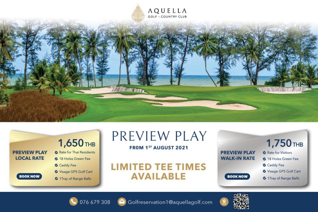 สนามอะเควลล่า กอล์ฟ แอนด์ คันทรี คลับ อ.ท้ายเหมือง จ.พังงา เตรียมเปิดต้อนรับนักกอล์ฟได้มาสัมผัสบรรยากาศสวรรค์บนกรีนเลียบชายฝั่งทะเลอันดามัน โดยจะเปิดให้ทดลองเล่นได้ตั้งแต่วันที่ 1 สิงหาคม 2564 (เฉพาะผู้ที่จองเวลาออกรอบล่วงหน้า) ด้วยแพคเกจพิเศษสำหรับชาวไทยและไทยเรสซิเดนท์ออกรอบราคา 1,650 บาท (รวมกรีนฟี 18 หลุม แคดดี้ รถกอล์ฟพร้อมระบบ Visage GPS และลูกซ้อมไดร์ฟ 1 ถาด) ชาวต่างชาติทั่วไปราคา 1,750 บาท สอบถามรายละเอียดเพิ่มเติมและจองเวลาออกรอบได้ตั้งแต่วันนี้เป็นต้นไป ทางหมายเลขโทรศัพท์ 076-679-308 หรือ อีเมล golfreservations1@aquellagolf.com (รับจำนวนจำกัดในแต่ละวัน)
